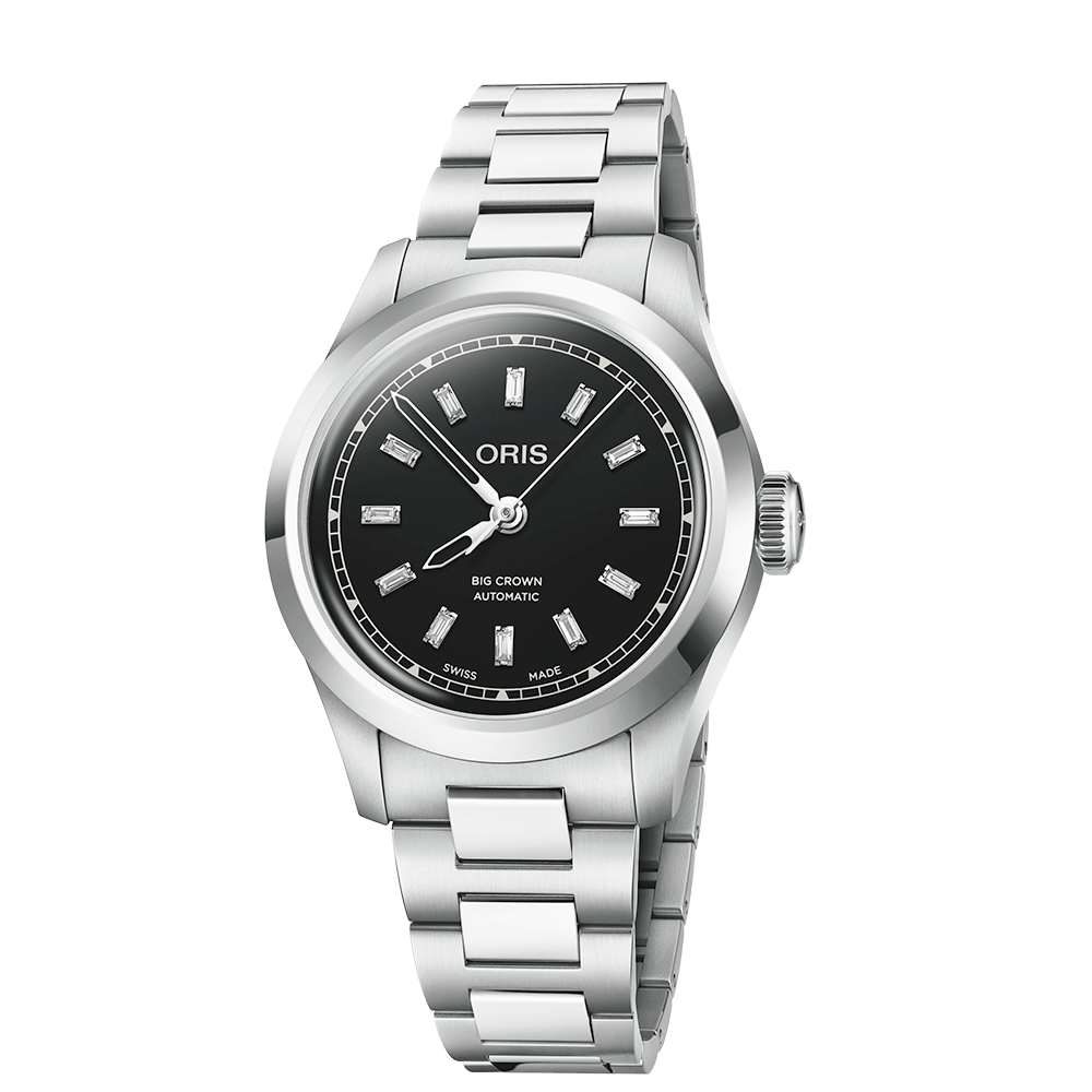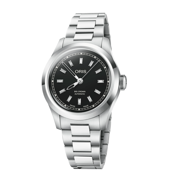 This glamorous version of the new Big Crown Automatic 34.00 mm is elevated by 12 baguette-cut diamond hour markers on its gloss black dial. It also has skeleton hands, an H-link metal bracelet and a Swiss Made automatic mechanical movement.