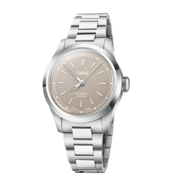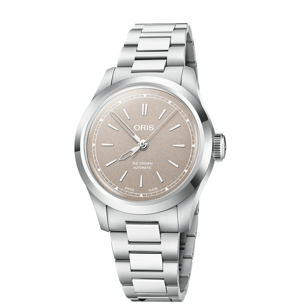 Introducing the Big Crown Automatic 34.00 mm, a fresh smaller iteration of an classic Oris design. It features a textured beige dial, skeleton hands, an H-link metal bracelet and a Swiss Made automatic mechanical movement. Intentional design & ergonomics for smaller wrist.