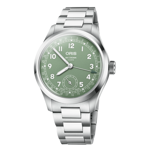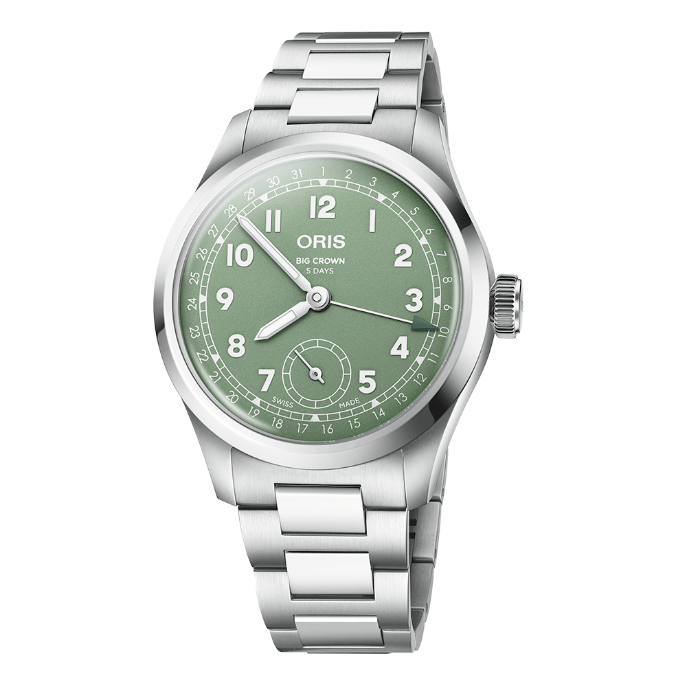 Meet the new Big Crown Pointer Date! With this Big Crown Pointer Date, a signature design of Oris, the case & bracelet have been modified. The Caliber 403 Earthy Green dial features a 40mm case and a new H-link bracelet with an Oris-developed clasp that wraps seamlessly around your wrist. A multi-activity watch for today’s world citizen.