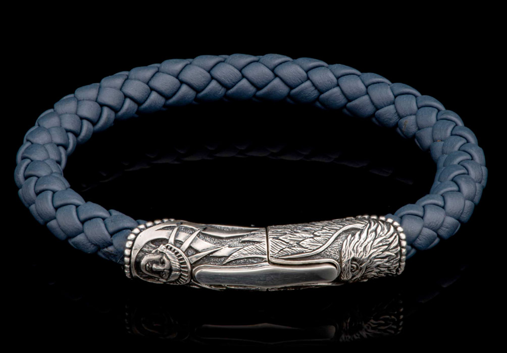 The Blue Ridge brings our honored American heritage to life, timeless images sculpted from generations past, and for generations into the future. This bracelet features a beautifully carved centerpiece/clasp in sterling silver with a double secured magnetic closure. The antique white of the sterling is the perfect pairing to a supple and durable 8mm braided leather cord in an earth-tone blue/gray that wears well with any outfit, on any occasion.