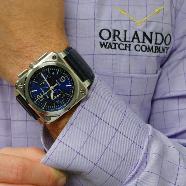 BR 03-94 Chronograph with blue dial and matching blue leather strap.