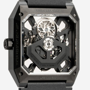 To maintain the purity of its design, the lugs have disappeared and the housing for the rubber strap has been cut out of the volume of the case. Grinding using diamond powder meant the facets could be reworked and the volumes of the timepiece accentuated.