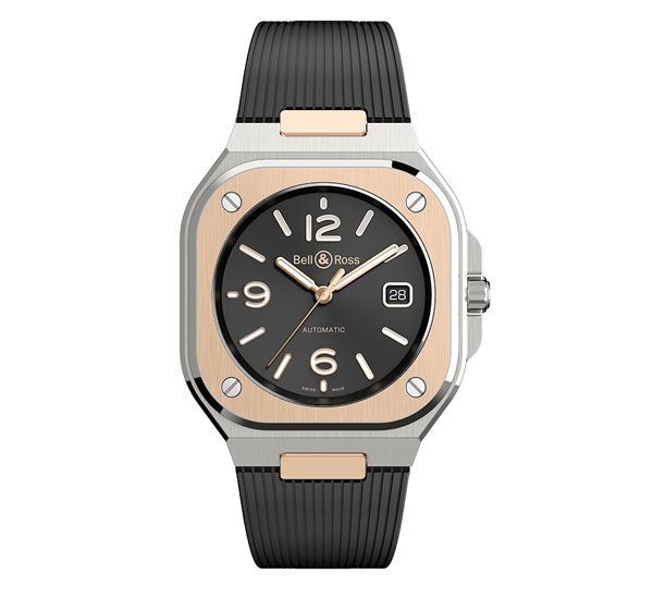 With its smart and classic look, this second addition to the BR05 collection takes you back into the 80’s spirit by mixing two‑tone.When a technical material meets a precious substance. The combination of satin-finished and polished steel and 18 ct rose gold. The fusion of robustness and sophistication. Featuring the brand’s iconic graphism, the black sunray dial contrasts perfectly with the rose gold applique numerals, indices, and skeletonised hour and minute hands. For optimum legibility, the latters are filled with Super-LumiNova®.