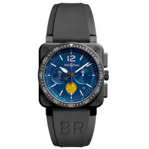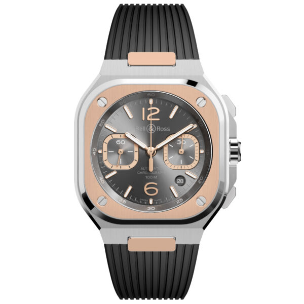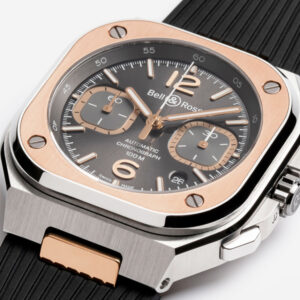 The BR 05 chronograph from Bell & Ross is a masculine, sculptural piece, a powerful instrument full of character with carefully executed finishes. Bell & Ross embodies the urban spirit with the BR 05 Grey Steel & Gold, which features a 42-mm steel case with 18 carat rose gold details. Its galvanised dial in sunray grey ruthenium adds a modern touch to this resolutely unique timepiece.