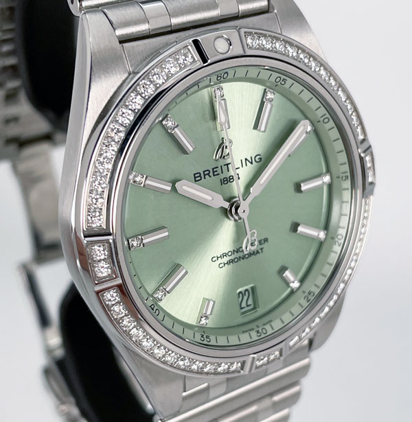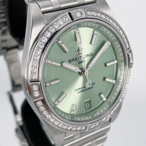 Near mint condition pre-owned Breitling Chronomat 36 A10380 in stainless steel, diamonds and a mint green dial. A certified chronometer automatic movement is housed in a 36mm case and paired with the ultra comfortable “Rouleaux” bracelet.