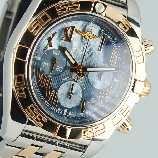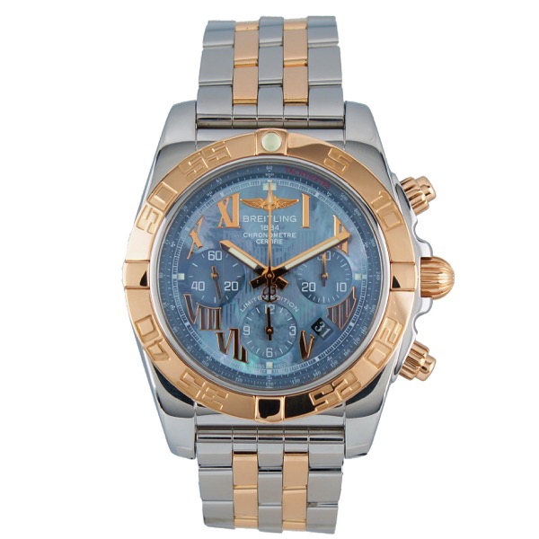 Pre-Owned Breitling Chronomat CB0110 limited edition 44mm in stainless steel & 18K Rose gold with a blue mother of pearl dial. Limited edition to 250 pieces.