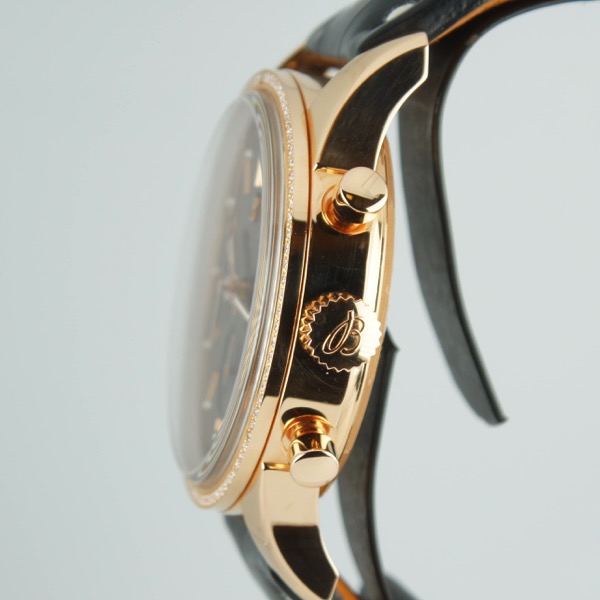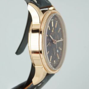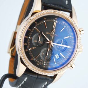 Excellent condition Breitling Transocean Chronograph RB0152 in 18K Rose gold. 43mm rose gold case with a factory diamond bezel and a crisp black dial; Complete with a factory black alligator strap and 18K RG clasp.