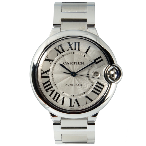 Near mint Cartier Ballon Bleu in 40mm and stainless steel. This sleek and elegant timepiece is in near mint condition with minimal wear featuring a guilloche Roman numeral dial and powered by a Cartier automatic caliber.