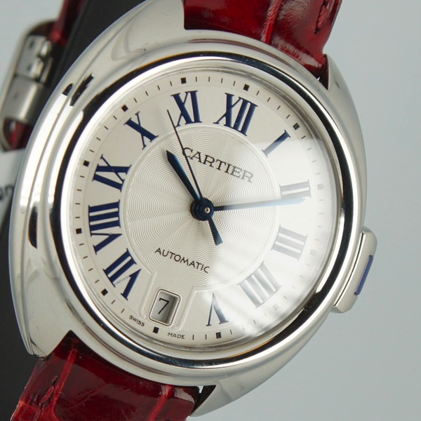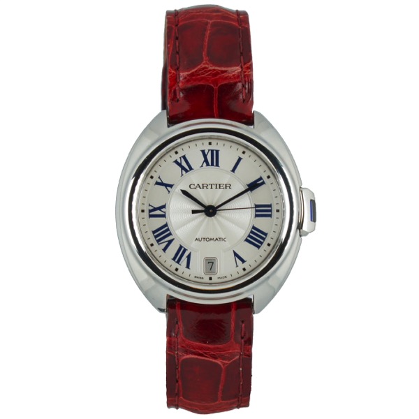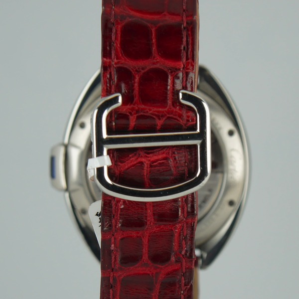 Excellent condition Cartier Cle de Cartier in stainless steel. This timeless and elegant timepiece is in excellent featuring a guilloche Roman numeral dial, powered by a Cartier automatic caliber and on a Cartier red alligator strap with a folding clasp