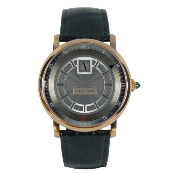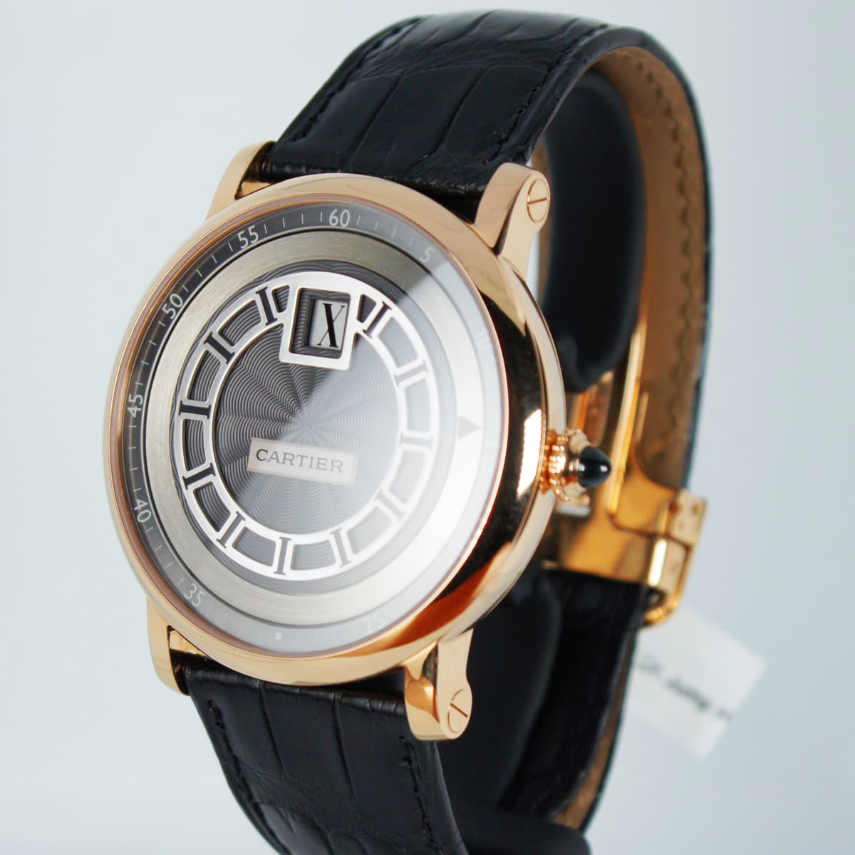 Near mint condition Cartier Rotonde de Cartier in 18K rose gold. Featuring a dark anthracite grey Guilloche dial, automatic movement with jumping hours (Roman numeral jump hour disc) and on a factory Cartier alligator strap with a Cartier 18K RG folding clasp.