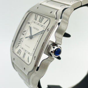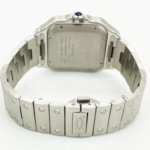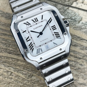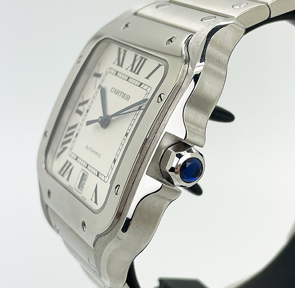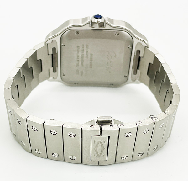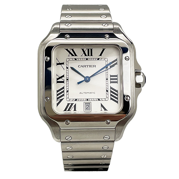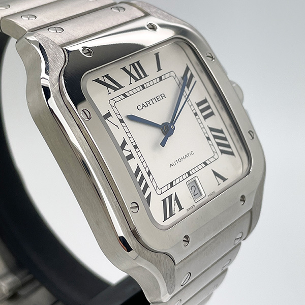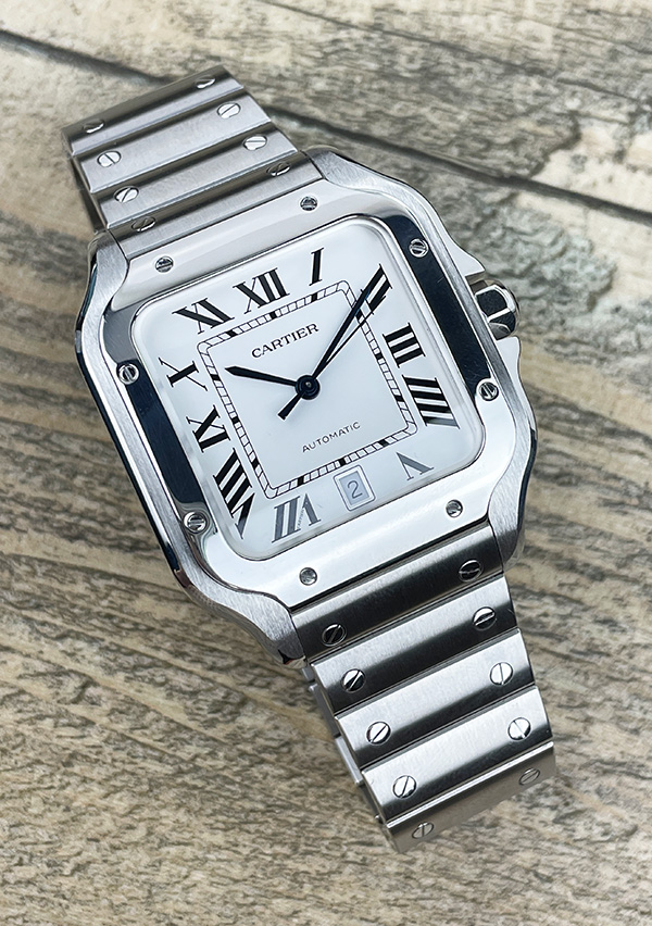 Excellent condition Cartier Santos in 39.8mm. In stainless steel with a interchangeable stainless steel bracelet and powered by an automatic movement.