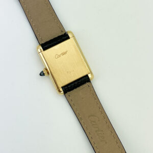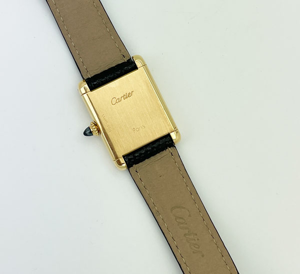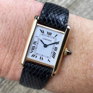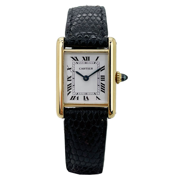 A classic Cartier Tank in 18K yellow gold. Featuring a white dial, black Roman numeral, blued steel hands, a manual winding movement and on a Cartier lizard strap with light wear. The case measures 20.6mm x 28mm.