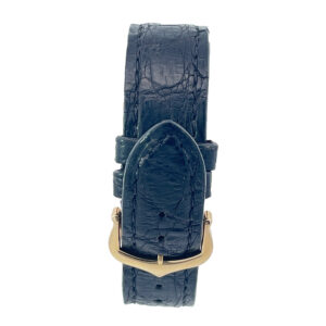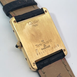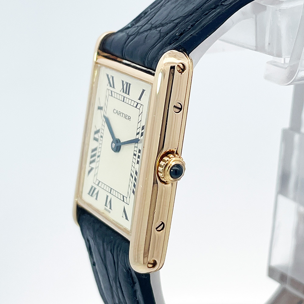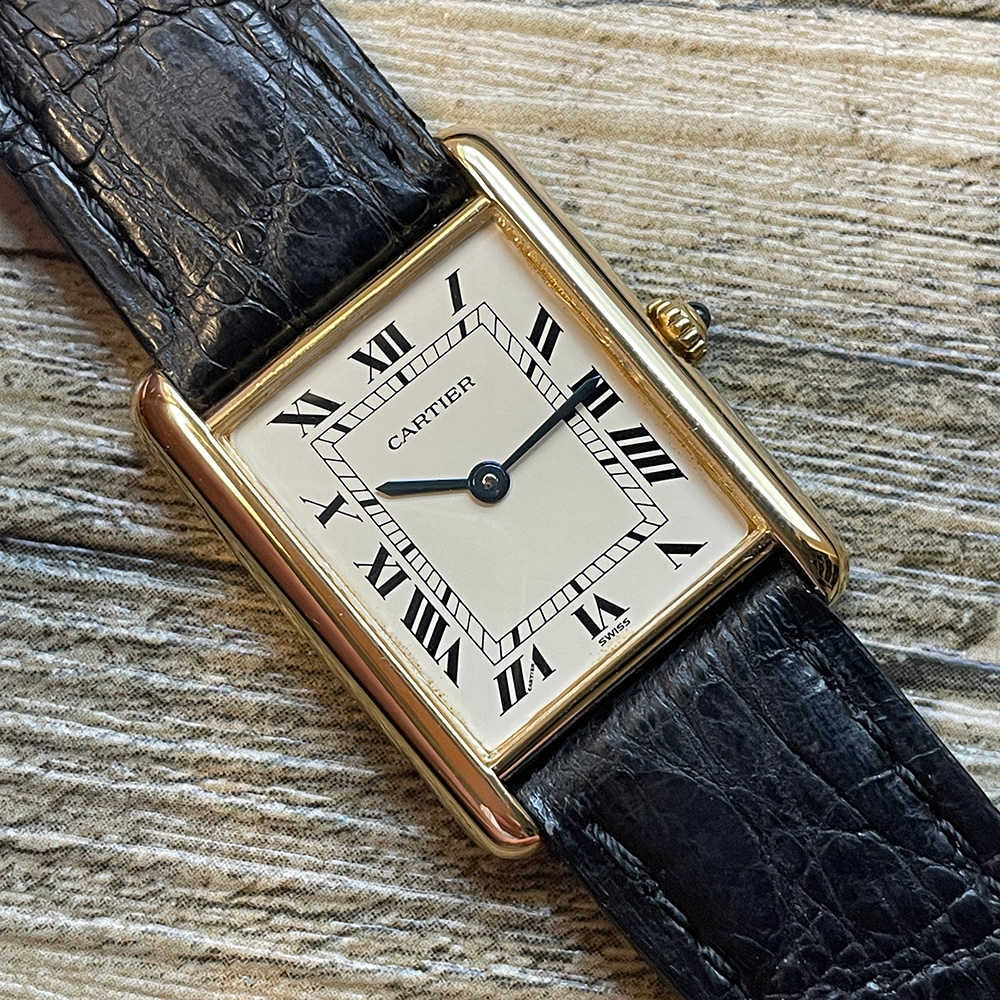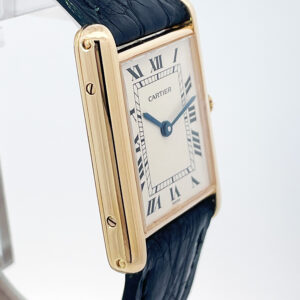 A classic Cartier Tank in 18K yellow gold. Featuring an off white dial, black Roman numeral, blued steel hands, a quartz movement and on a Cartier alligator strap with pin buckle. The case measures 23.5mm x 30mm.