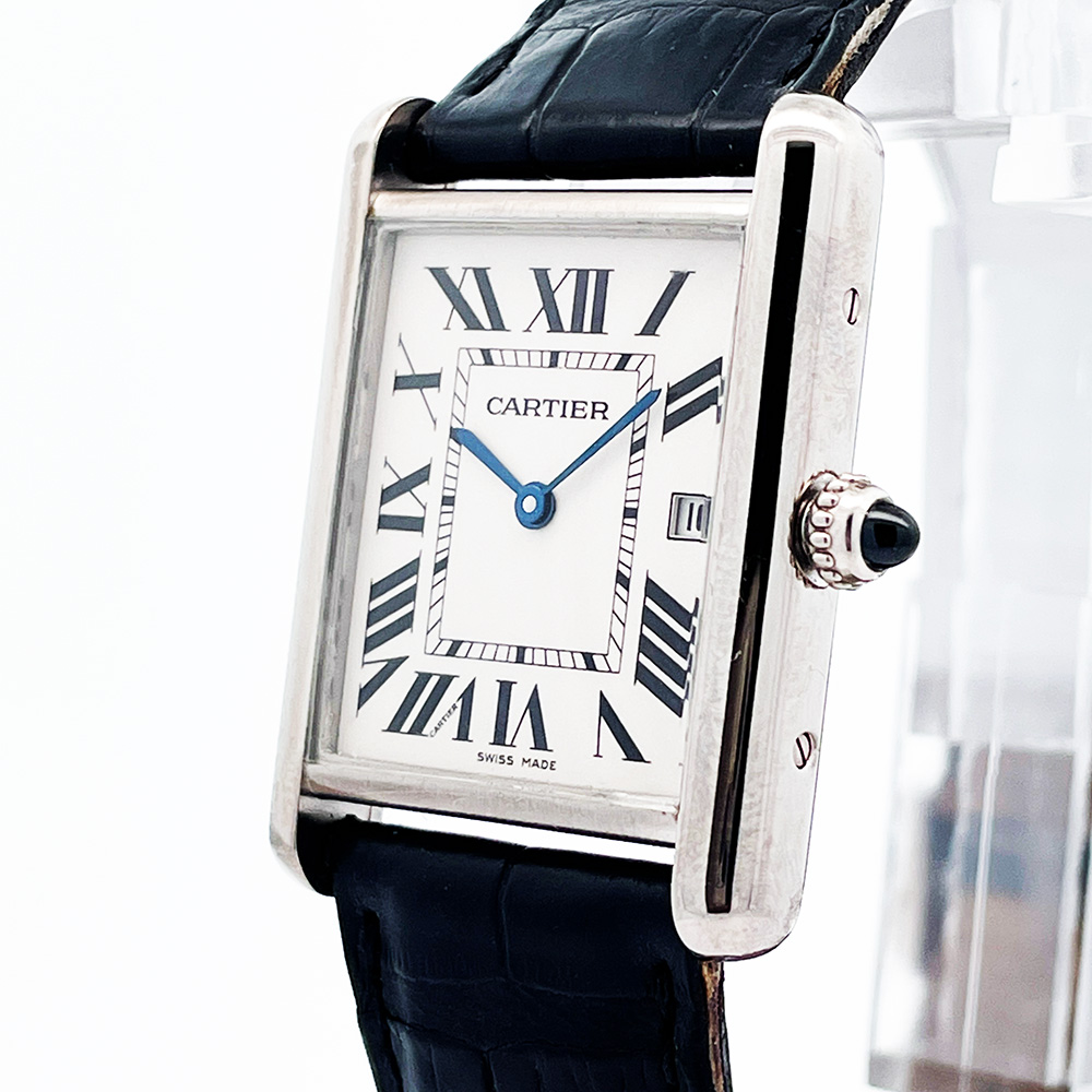 A classic Cartier Tank Louis in 18K white gold. Featuring a silver dial, black Roman numerals, blued steel hands, a quartz movement and on a Cartier alligator strap with 18K WG Cartier pin buckle. The case measures 23.5mm x 30mm.