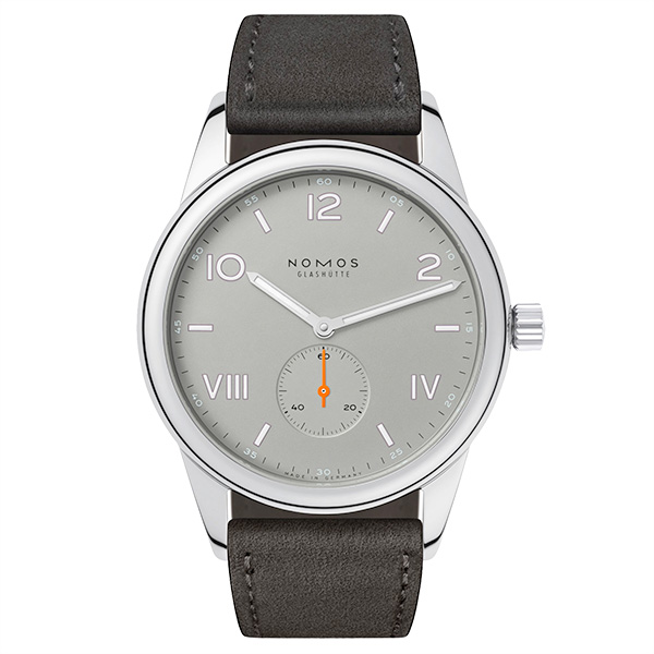 A watch for many occasions. Club Campus Absolute Grey features a robust, highly polished steel case with a wide bezel and is water resistant up to 100 meters. Superluminova-coated numerals, hands and hour markers glow blue in the dark and underwater. The dial is contrasting and clear. Minute and second numerals in neon orange increase readability, with the second hand also making its rounds in neon orange. The hand-wound watch from Glashütte is driven by the reliable NOMOS caliber Alpha.