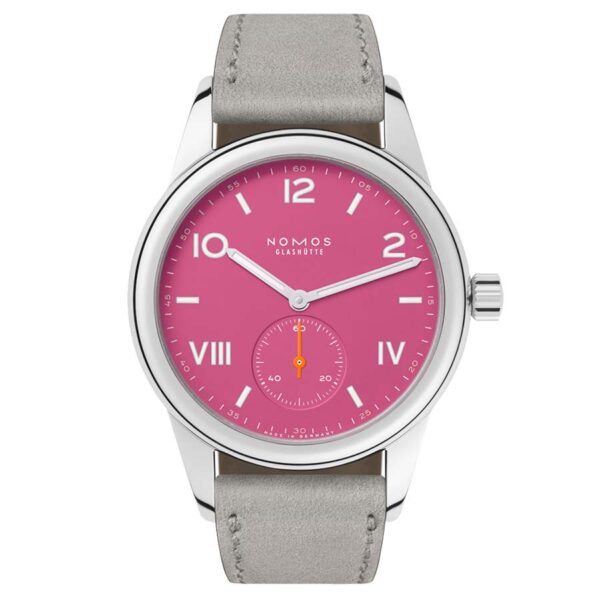 A watch for many occasions. Club Campus deep pink features a robust, highly polished steel case with a wide bezel and is water resistant up to 100 meters. Superluminova-coated numerals, hands and hour markers glow blue in the dark and underwater. The dial is contrasting and clear. Minute and second numerals in white increase readability, while the second hand makes its rounds in neon orange. The hand-wound watch from Glashütte is driven by the reliable NOMOS caliber Alpha. Deep pink stands for a positive attitude to life. This watch is a symbol of motivation to achieve goals and encouragement to forge new paths.