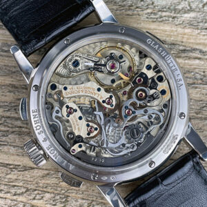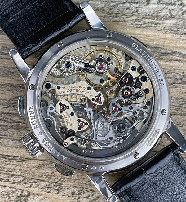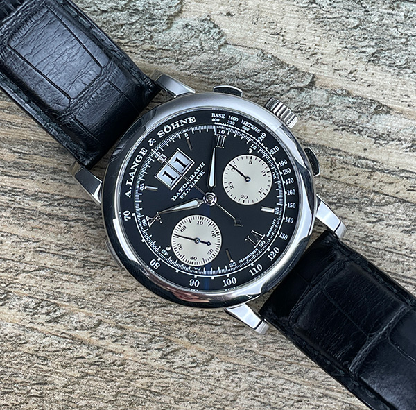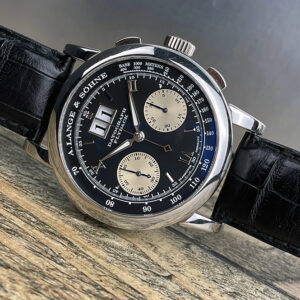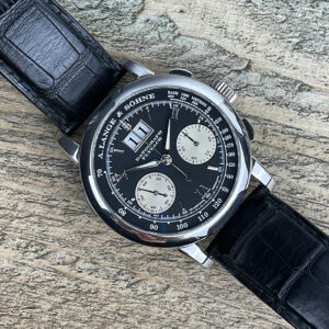 A. Lange & Sohne Datograph 405.035 in platinum. In excellent condition with normal wear. On factory alligator strap with platinum pin buckle.
