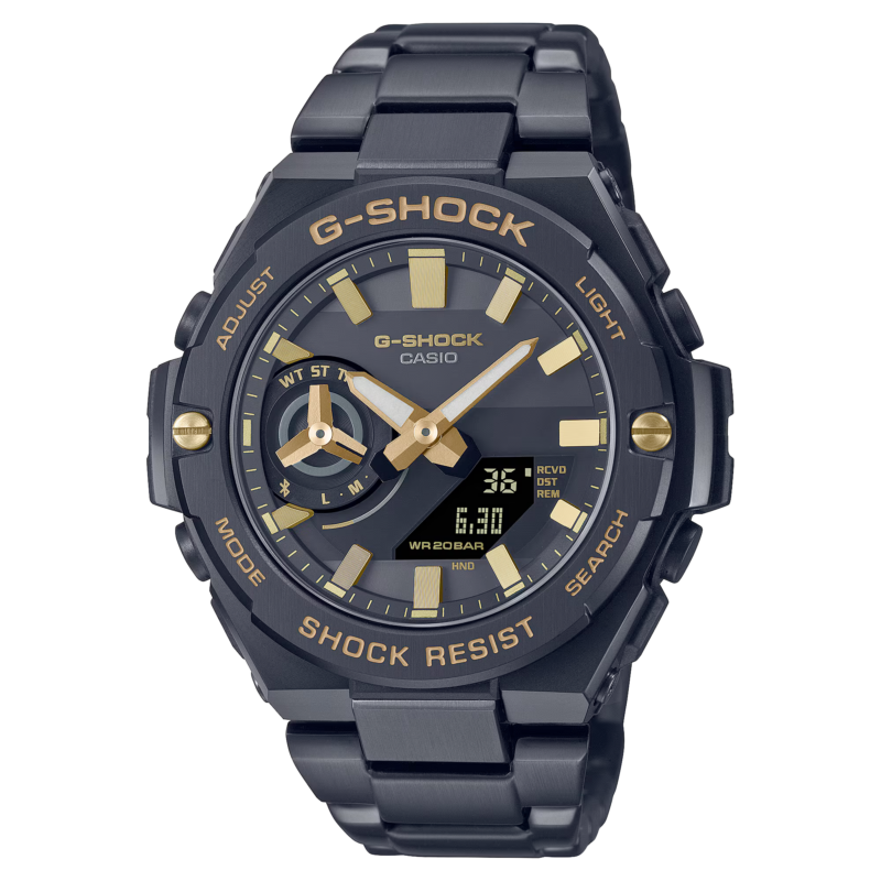 Tough construction meets stylish design in a black ion-plated metal bezel set against a base of jet black. With its slim combination module and Carbon Core Guard structure, the black-on-black take of the GSTB400 is a cool fashion statement ready for whatever you are.
