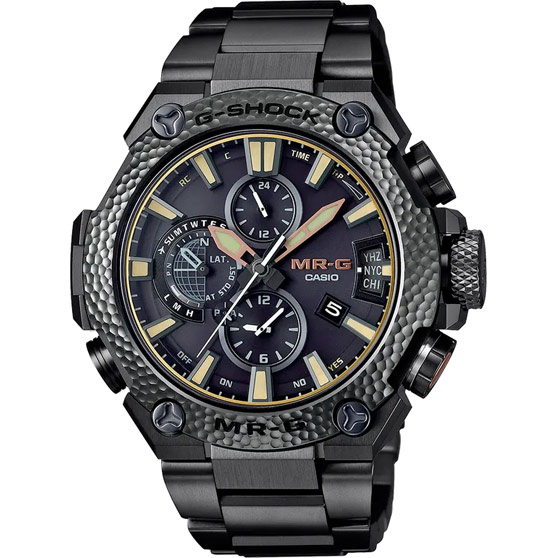 Introducing a new model from MR-G, the top of the G-SHOCK line, that packs Bluetooth® GPS radio-controlled solar-powered timekeeping into an elegant design featuring a hammered finish bezel.Traditional tsuiki metal hammering has been used in Japan for centuries in the production of armor, copperware, and other metal implements using a mallet and special chisel that leave marks that create a distinctive pattern on the metal. These marks resemble the scales seen on black dragon drawings and make each item a work of art. The painstakingly hammered patterns of the metal reflect the personality of the artisan who created them, and identify the handmade nature of each item. This traditional Japanese aesthetic sense is applied to a shock-resistant, full-metal body that houses a 3-Way Connected Engine for accurate timekeeping virtually anywhere in the world. The result is absolute toughness and absolute accuracy that is distinctively MR-G.