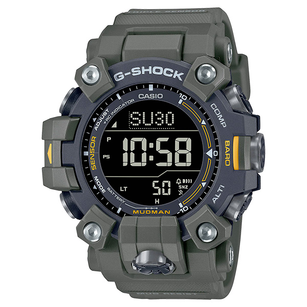 Slim, yet powerful, this MUDMAN design packs full-on functionality in a striking exterior built with an intricate combination of components. The digital compass is more practical than ever thanks to the dual-layer LCD, which displays compass graphics on the top layer and time and other readings on the layer below. The GW-9500-3 and GW-9500-1A4 feature a negative dual-layer LCD. Taking utility to a whole new level, radio-controlled solar power delivers precision timekeeping powered by light, while Super Illuminator ensures visibility, even in dark places.