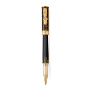 Coloured a sombre charcoal, but accented in contrasting yellow gold, the House Baratheon pen features a stag’s head for its pocket clip, with a stag rampant on the cap’s top, above the motto, “Our Is The Fury”. A fleur-de-lis pattern decorates the cap.