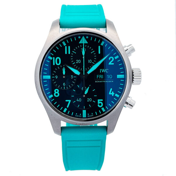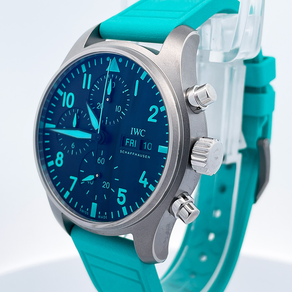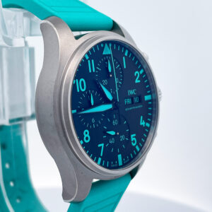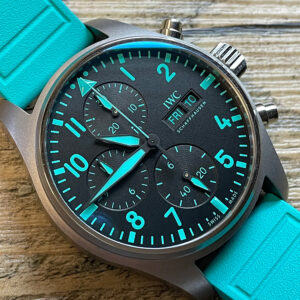 Mint condition IWC Mercedes-AMG Patronas Pilot’s watch in titanium with rubber strap and additional grey textile strap. Housed inside is the IWC 69385 chronograph caliber with day & date features. Included are two straps utilizing the IWC bracelet quick release system.