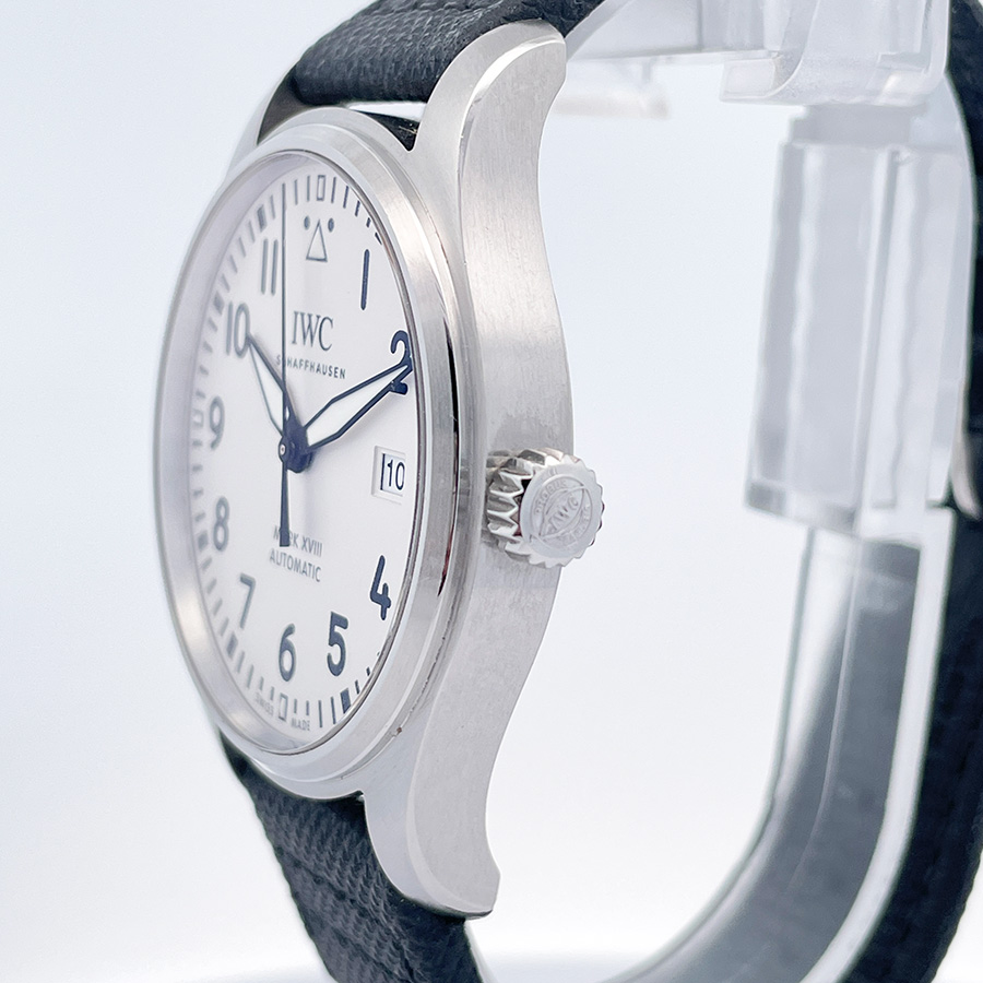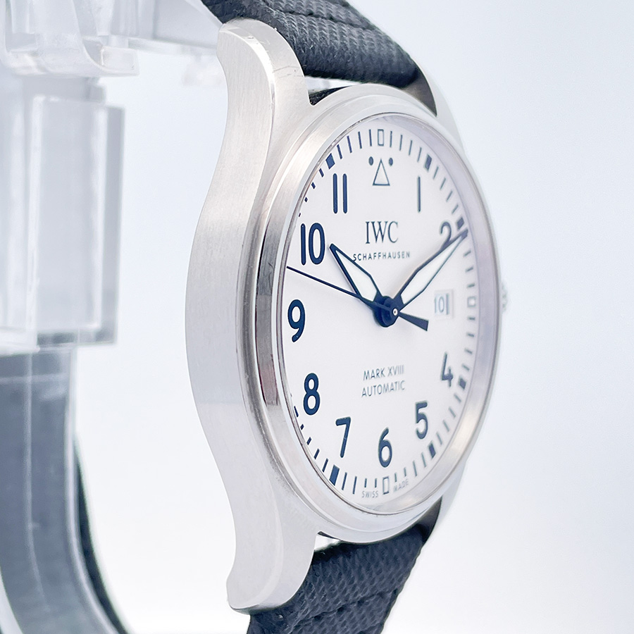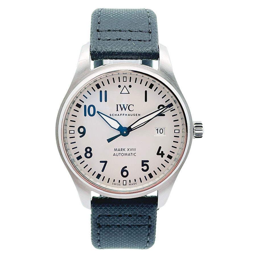 IWC Spitfire Pilot’s Watch Mark XVIII IW327002 in stainless steel with a silver white dial and original IWC textile strap and clasp