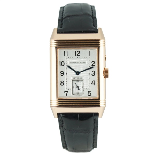 Excellent condition Jaeger LeCoultre Reverso Day Night 270.254 in 18K RG. This Reverso features a dual case with a silver & black dial and on factory alligator strap with 18K RG folding clasp..