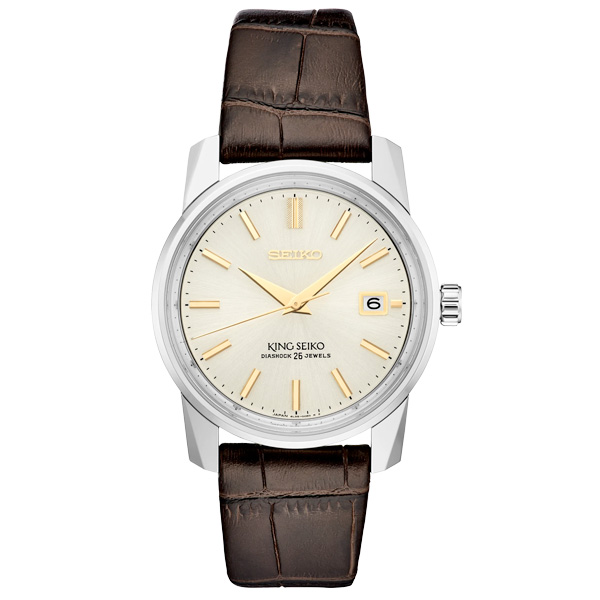 King Seiko KSK Re-Creation Limited Edition. Introduced in 1961 and in production until 1975, King Seiko became one of the Seiko’s most technically innovative and stylish brands, noted for its sleek, dignified angularity. Re-creating the King Seiko KSK of 1965, with its slightly sportier and more practical features, this exceptional Limited Edition is available only in a controlled-production run of 1,700, with the serial number engraved on each screwback case. With a larger case and upgraded box-shaped anti-reflective sapphire crystal, this streamlined re-creation includes a thin automatic caliber movement with a frequency of 28,800 vibrations per hour, a power reserve of approximately 45 hours, and manual winding capability. The pale champagne dial features a calendar, textured 12 o’clock marker, and subtle gold accents. Crafted of stainless steel, this distinctive timepiece also offers a box shaped sapphire crystal with anti-reflective coasting on the inner surface, and a brown crocodile strap, and sports the King Seiko crest on its caseback as well as stylized Seiko logos on the crown and buckle. Presented in a Limited Edition collectors’ box. 5 bar, 50M Water Resistant.