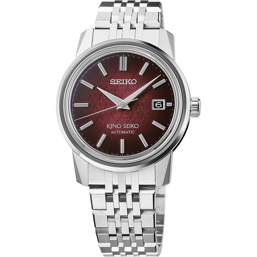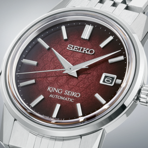 King Seiko KSK Modern Re-Interpretation SJE103. The dial of this stunning timepiece expresses “Garyu-Bai,” a plum tree named for its unique shape, dramatically showcasing a newly created plum blossom pattern and bright red gradation. Designed for sophistication and comfort, this elegant timepiece is engineered with a slim 10.7mm case, as well as sharply delineated case and crystal edges. The 26-jewel 6L35 caliber movement, with a frequency of 28,800 vibrations per hour, a power reserve of approximately 45 hours.