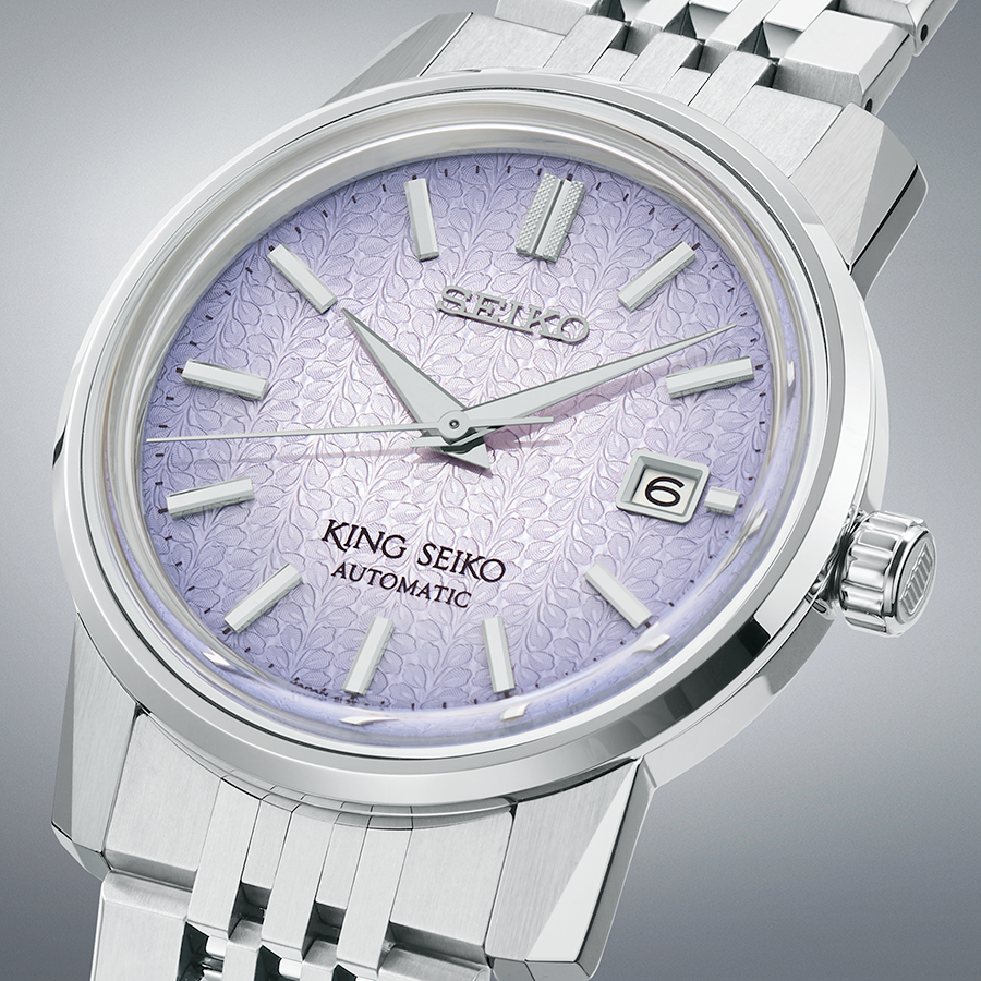 King Seiko KSK Modern Re-Interpretation SJE107. the dial of this stunning timepiece expresses “Tenjin Fuji Violet,” dramatically showcasing a pale violet gradation and a wisteria flower pattern, inspired by the vibrant blooms at the Tenjin Shrine in Kameido, Japan, the birthplace of King Seiko. Designed for sophistication and comfort, this elegant timepiece is engineered with a slim 10.7mm case, as well as sharply delineated case and crystal edges. The 26-jewel 6L35 caliber movement, with a frequency of 28,800 vibrations per hour, a power reserve of approximately 45 hours.