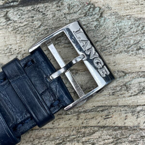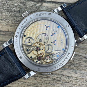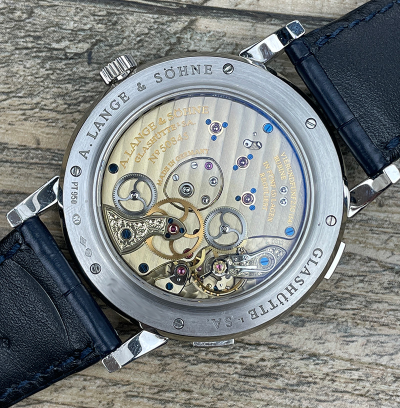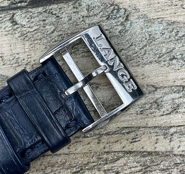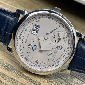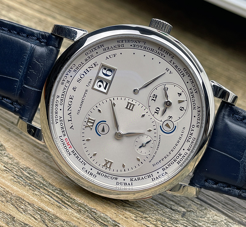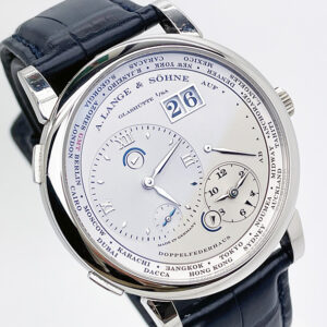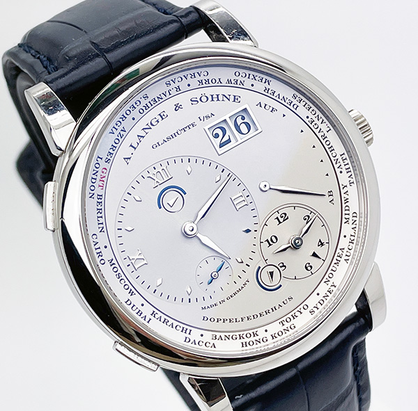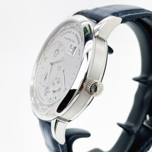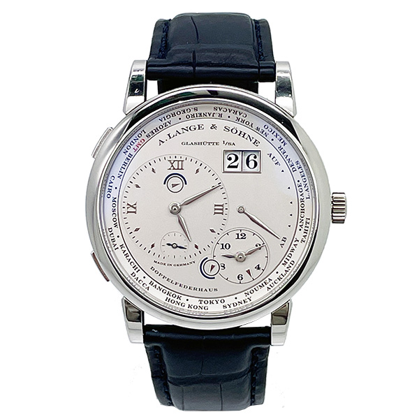 A. Lange & Sohne Lange 1 Time Zone 116.025 in platinum. In excellent condition with minimal wear. On factory alligator strap with platinum pin buckle.