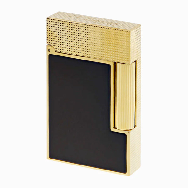 A full-sized classic Line 2 lighter featuring a yellow gold micro diamond head pattern with matte black lacquer and a perfect ping.