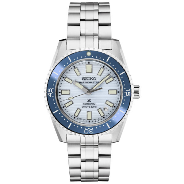 Prospex Marinemaster 1965 Diver’s Watch Re-interpretation. Distinguished by its blend of functionality and aesthetics, this extraordinary timepiece, part of the first globally launched watch series to bear the “Marinemaster” name, features the first see-through screwdown caseback on a Seiko diver’s watch, as well as an elegantly chamfered case and bezel and a flexible double-curved bracelet for a comfortable fit. Based largely on Seiko’s 1965 diver’s watch, the first made in Japan, this exceptional timepiece extends the Prospex tradition of celebrating its rich legacy of innovation in high-intensity timekeeping by re-creating and re-interpreting signature achievements with today’s finest technology and materials. Visible beneath the caseback, the thin, but exceptionally accurate, 26-jewel 6L37 movement beats at a frequency of 28,800 vibrations per hour, and provides a power reserve of approximately 45 hours and manual winding capability. Framed by a uni-directional rotating elapsed timing bezel, the distinctively patterned blue dial offers LumiBrite hands and markers.