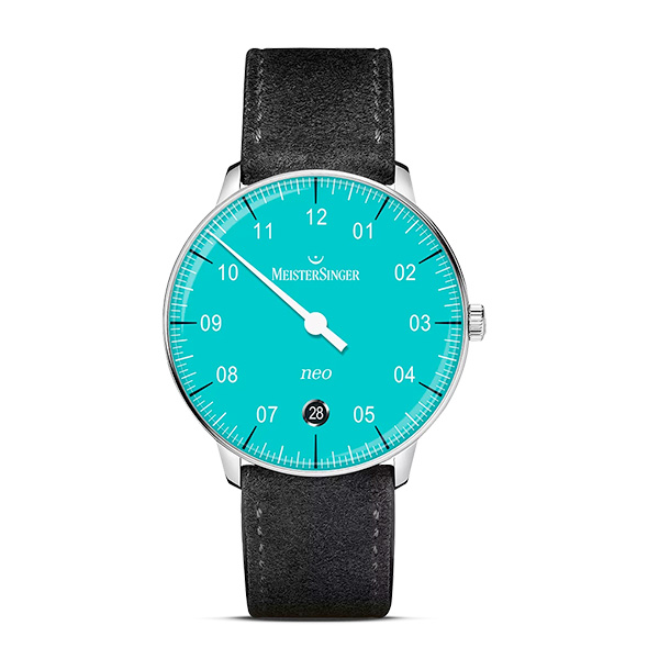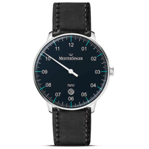 The Neo combines the design of the 60s with the unique characteristics of a MeisterSinger watch. In this version, the rich azure blue emphasizes the New Vintage character. The functional typography with its continuous double-digit hour numerals from 01 to 12, the circumferential five-minute divisions, the single needle-shaped hour hand make this watch a genuine MeisterSinger classic. The extended marker at 6 o’clock points to the circular date window with its highly polished, silver-plated bezel.