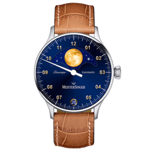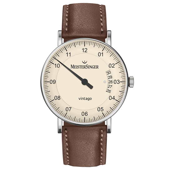 But whereas MeisterSinger’s Neo looks at first glance like it’s been around since the 1950s, the Vintago’s design is also quite contemporary at the same time. Its curved single hand rotates around a multi-level dial, thereby adding further depth to its geometric appearance. The generous arched segment of the date display is cut out of the raised center. Both the form and the content are highly typical for MeisterSinger, as the wearer has an overview of five calendar days and a small dot marks the current date.
