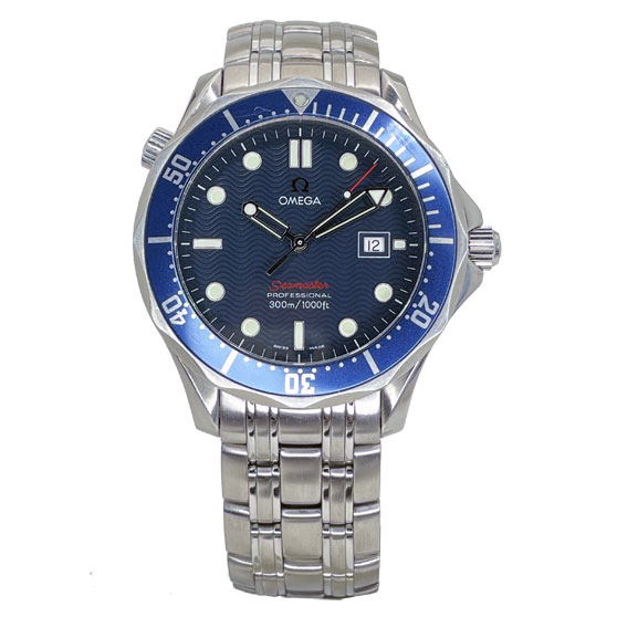 Omega Seamaster 300m is available in our Pre-Owned Collection. It features the blue wave dial and quartz movement.