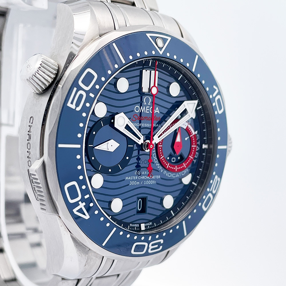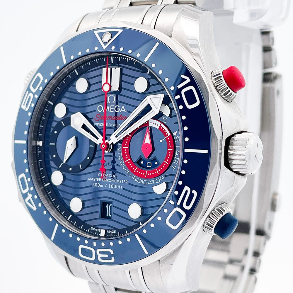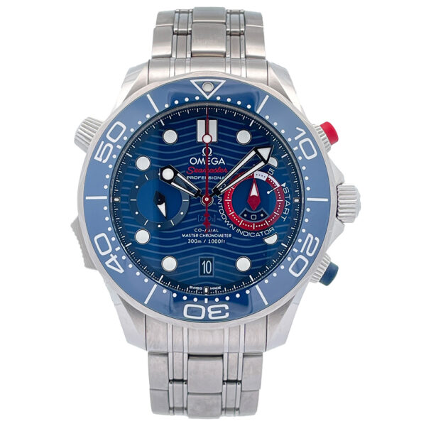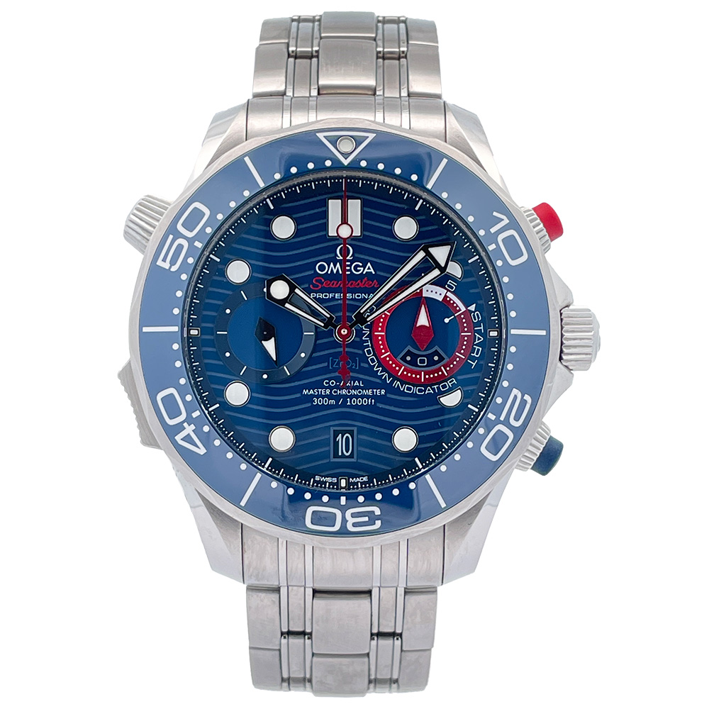 Excellent condition pre-owned Omega Seamaster America’s Cup 210.30.44.51.03.002 wrist watch in stainless steel with a blue dial, blue ceramic rotating bezel, and a Co-Axial chronograph movement with regatta countdown timer.