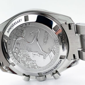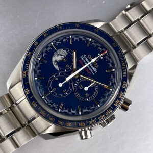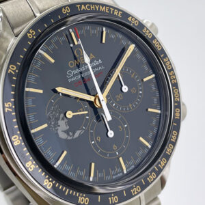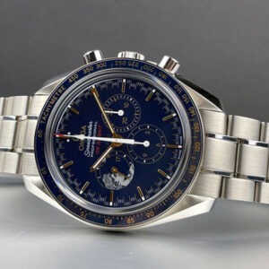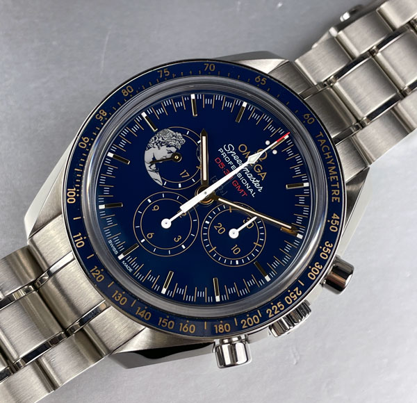 Blue with gold accents. “05:34 GMT” is printed on dial which is when Gene Cernan made the final step on the moon. God Apollo at 9 o’clock register. –