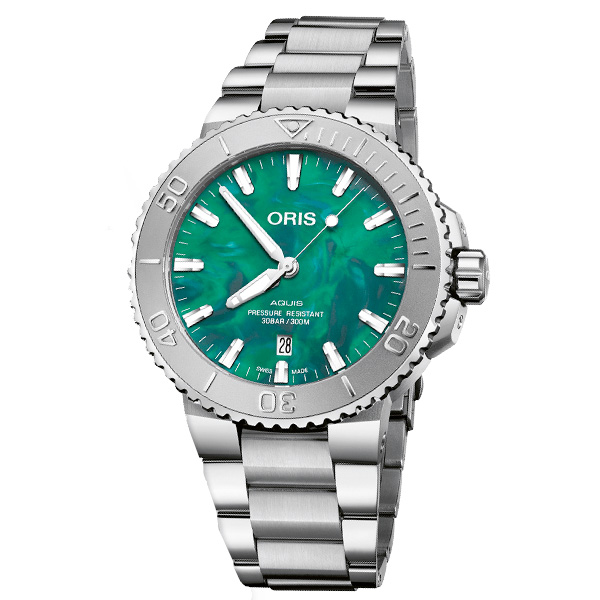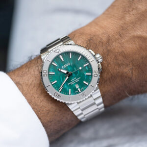The net effect: Oris announces a new partnership with the social enterprise Bracenet, which makes accessories from upcycled ‘ghost’ fishing nets – and now, spectacular watch dials. Making these kaleidoscopic dials involves taking small green, blue and white off cuts and gently warming them until they melt into the raw material. As they cool, they harden into a thin sheet of material. This is then cut to size, planed, and sanded down until it’s just 0.3mm thick. The material contains no additives, fillers or glues. No two dials are the same.