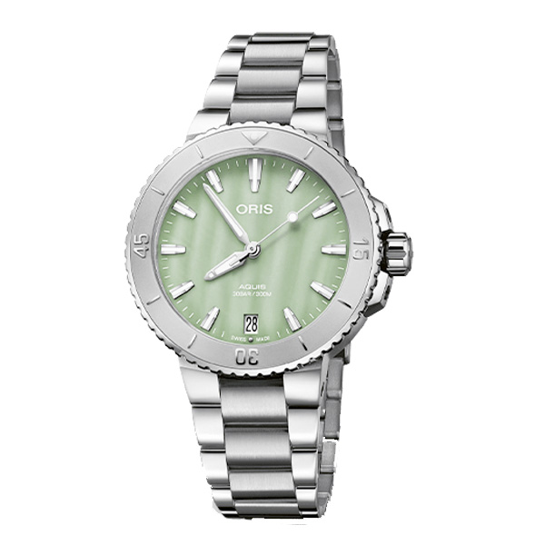 The familiar, tapered silhouette of the Aquis Date diver’s watch forms the base for each of the three pieces, but they will be remembered first for their high contrast Blush Pink, Aegean Blue and Seafoam Green dials.