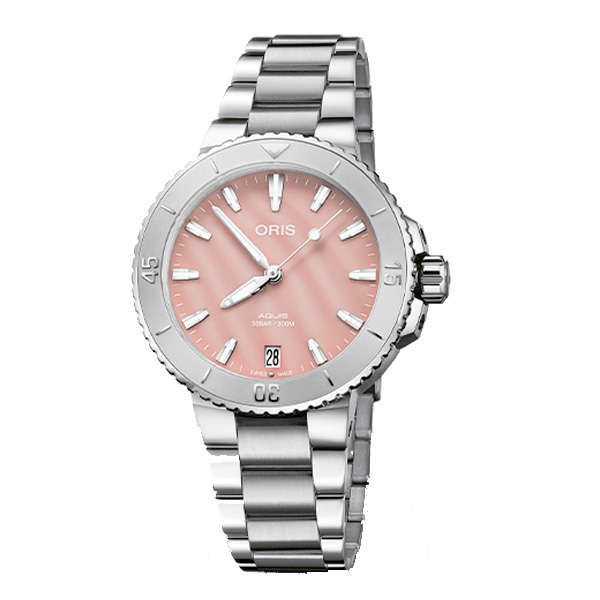 The familiar, tapered silhouette of the Aquis Date diver’s watch forms the base for each of the three pieces, but they will be remembered first for their high contrast Blush Pink, Aegean Blue and Seafoam Green dials.