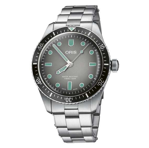 Oris has dived back in time and is delighted to present the Oris Divers Sixty-Five – a revival of an iconic diver’s watch that first appeared in the Oris collection 50 years ago. This new Oris Divers Sixty-Five Glow features a grey dial with bright contrasting turquoise green hour markers and hands that are legible in low light conditions. In the daylight, it contrasts with distinctive grey gradient dial. Available on a stainless steel rivit style bracelet or leather strap.
