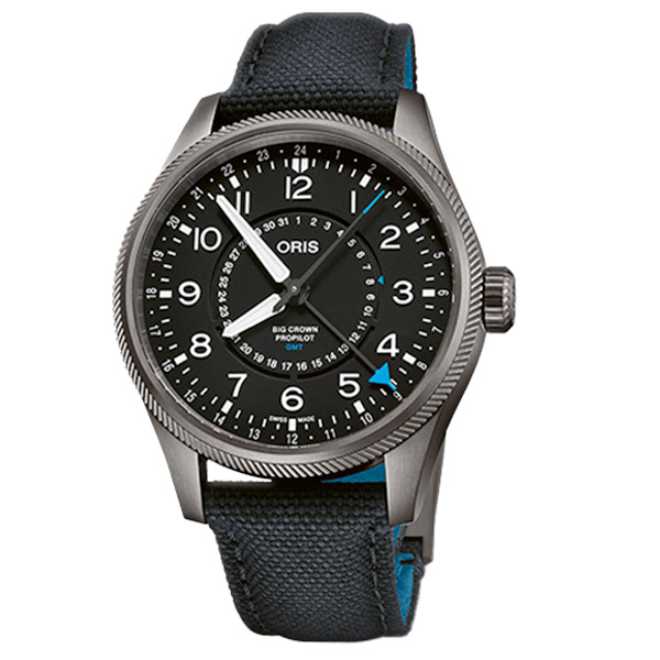 Oris ProPilot 57th Reno Air Races Limited Edition in a 41.5mm gray PVD treated stainless steel case featuring a black dial with blue accents; Automatic movement with GMT function and pointer date; Paired on a black textile strap and folding clasp. Limited to just 1,000 pieces.