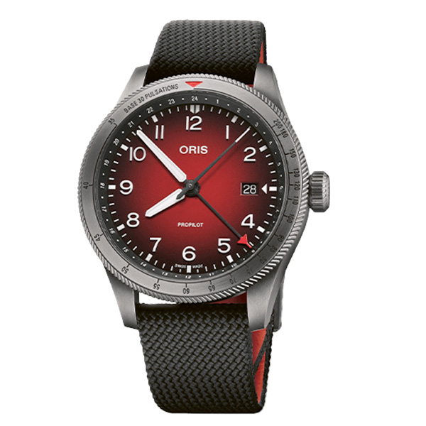 Oris ProPilot GMT in a 41.5mm gray PVD treated stainless steel case featuring a red vignette dial and 2nd timezone function. Paired on a black textile strap and folding clasp.