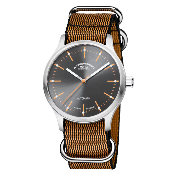 Serious gray meets creative orange, traditional mechanics meets lifestyle design, luxurious appeal meets perfect watch-life balance: the Panova Grey derives its special appeal from exciting contrasts. These give the new Mühle watch a very unique aesthetic and a multi-layered character. The best example of this is the gray metallic dial. Light and shadow play with its fine polish and captivate the viewer with fifty shades of gray.