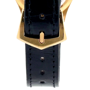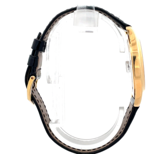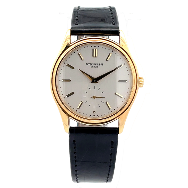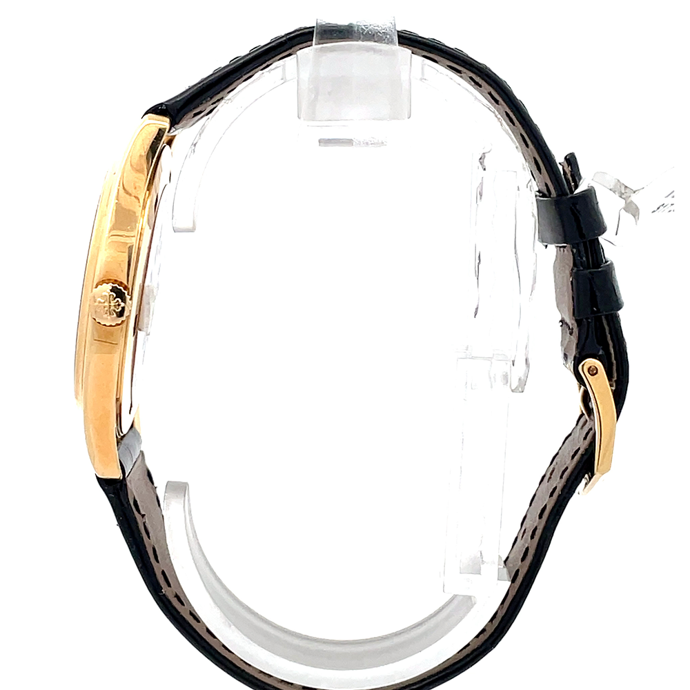 A distinguished example of the Patek Philippe Calatrava Ref. 5023J-001, crafted in 18K yellow gold and paired with its original factory leather strap and 18K YG tang buckle. This piece has been recently serviced by the Henri Stern Watch Agency (Patek Philippe’s official U.S. service center) in 2024, ensuring optimal performance — a true collector’s piece with impeccable provenance.
