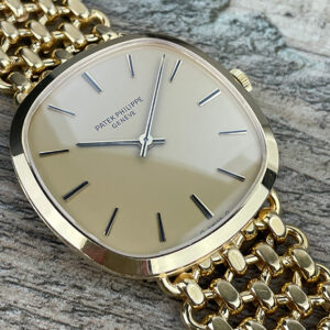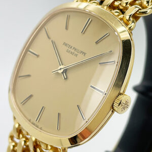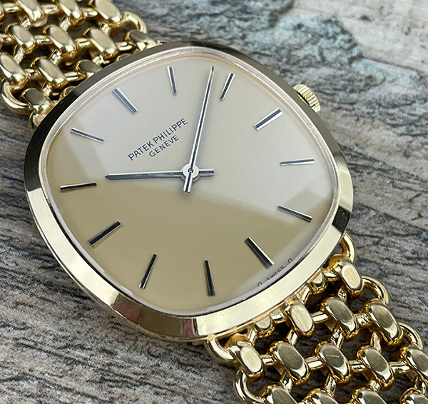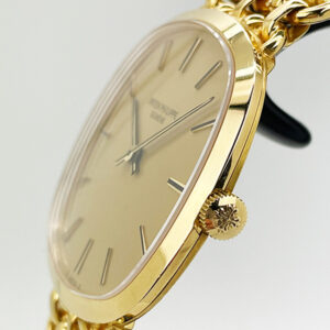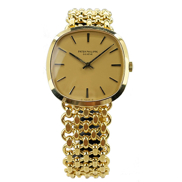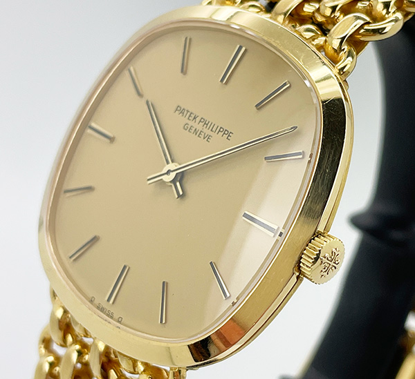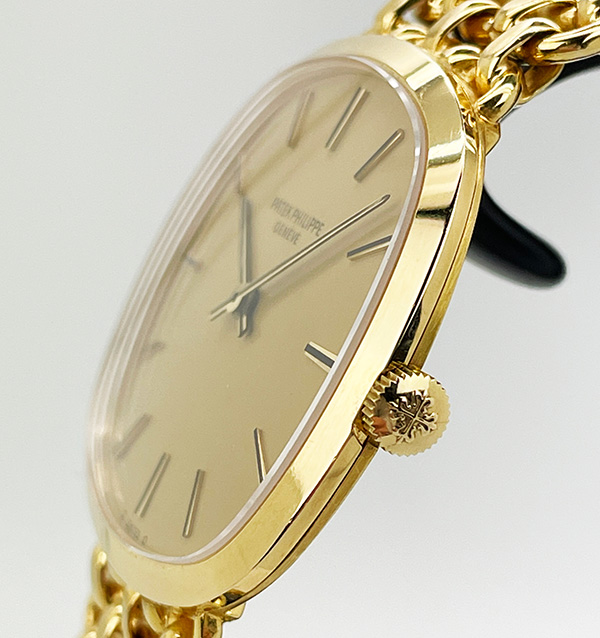 Great oversized vintage Patek Philippe from the mid 1970s. This Patek Philippe REF 6544-2 features a large oval 18K YG tw0-piece case with attached integrated bracelet, champagne colored dial and a manual winding movement, caliber 23-300. .