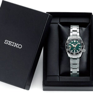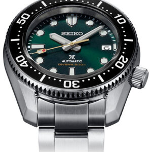 140th Anniversary 1968 Diver’s Watch Reinterpretation Limited Edition. Designed for those who treat life as the ultimate adventure, the Seiko Prospex line meets every challenge with technological excellence and style. To mark the 140th anniversary of the founding of Seiko, Prospex is celebrating its rich legacy of innovation in high-intensity timekeeping and the company’s role as the preferred watch for explorers under the sea, on land and in the air. Complete with a special Limited Edition caseback, this extraordinary watch, a reinterpretation of Seiko’s landmark 1968 diver’s watch with sleeker lines for versatile wear, also pays tribute to one of the world’s leading diving destinations, Irimote Island, one of the Yaeyama Islands, off Okinawa, nicknamed “the Galapagos of East Asia,” with a rich “Island Green” theme reflecting the verdant primeval forests of Irimote. The black uni-directional rotating elapsed timing bezel frames a green dial with date calendar and large LumiBrite markers and hands designed for enhanced legibility. The 24-jewel automatic movement beats at a frequency of 21,600 vibrations per hour, with a power reserve of approximately 70 hours, and can be wound manually or automatically. Crafted of stainless steel with super-hard coating, this superbly functional timepiece features an anti-reflective sapphire crystal, screwdown crown and caseback, and tri-fold push button release clasp with secure lock and extender, and follows ISO standards for scuba diving to depths of up to 200 meters. Includes an additional green silicone strap. 200m Water Resistant.