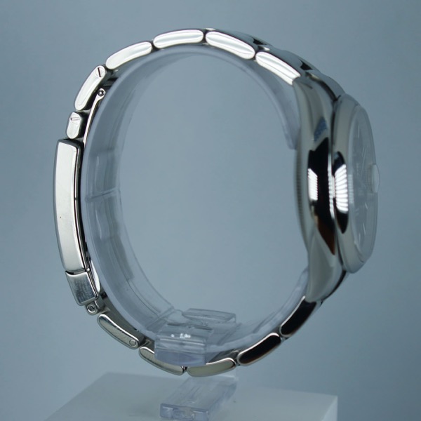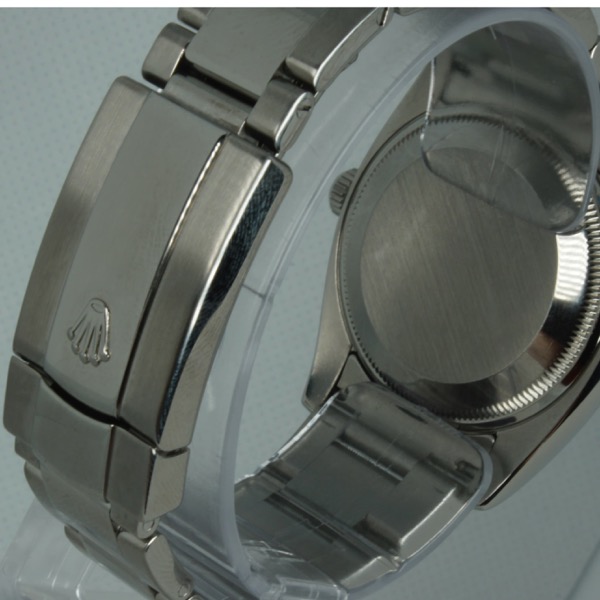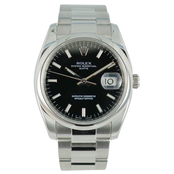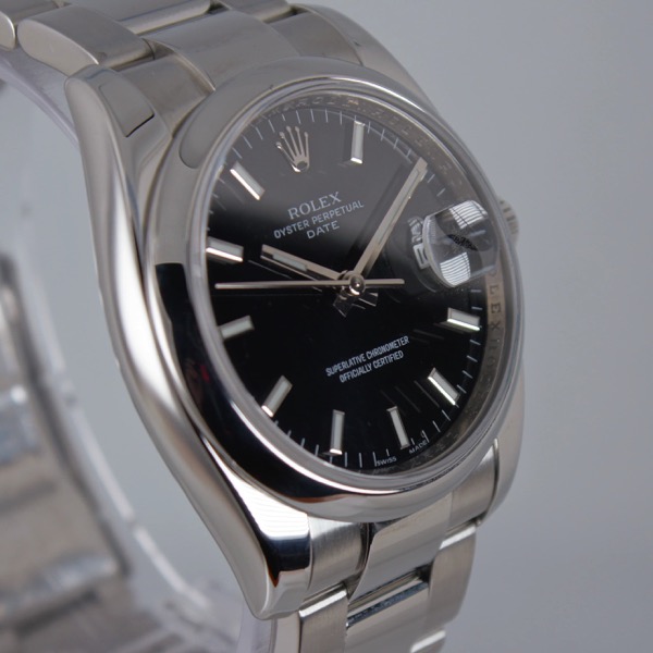 Pre-Owned Rolex Date in 34mm stainless steel featuring a black dial with luminous hour indexes and on an Oyster stainless steel bracelet and complete with the original box & booklets.